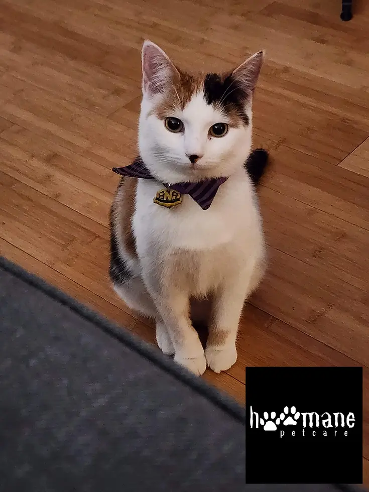 A purple Nevermore Academy collar with a bell becomes her trademark because she is that small & that quiet. Like a phantom, but with a jingle.